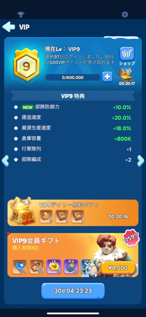 ホワイトアウトサバイバル:VIP9レベルの特典