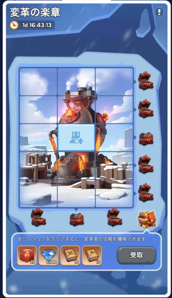 これは3×5の15マスにそれぞれミッションが与えられていて、それらをクリアするごとに報酬が手に入るってやつ。