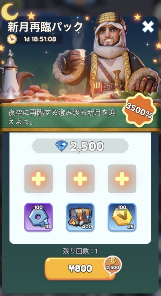 それでしかたなく今日は「新月再臨パック」というのに課金した。