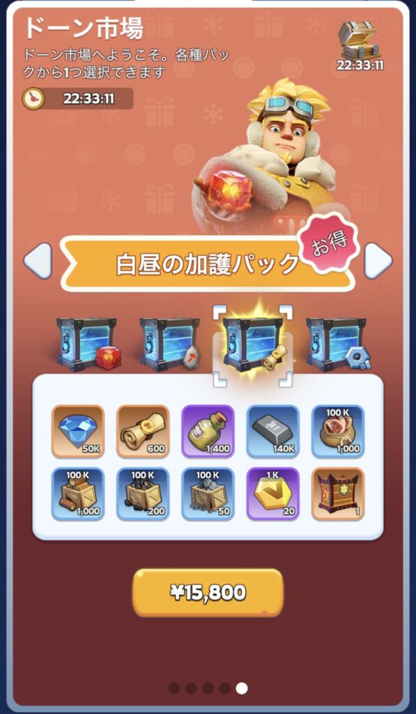具体的に言うと、今自分は領主装備のレベルを上げるために設計図面がめっちゃ欲しいんだけど、これをドーン市場の最高課金である白昼の加護パック(課金額 税込15800円)で増やすと全部で600個の設計図面が手に入る。