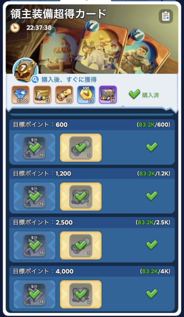 ホワイトアウトサバイバルでは週に1回更新される超得ウィークリーカードっていう課金があるんだけど、自分がレベルアップしていくと課金の効果も上がっていくようにできているみたい。