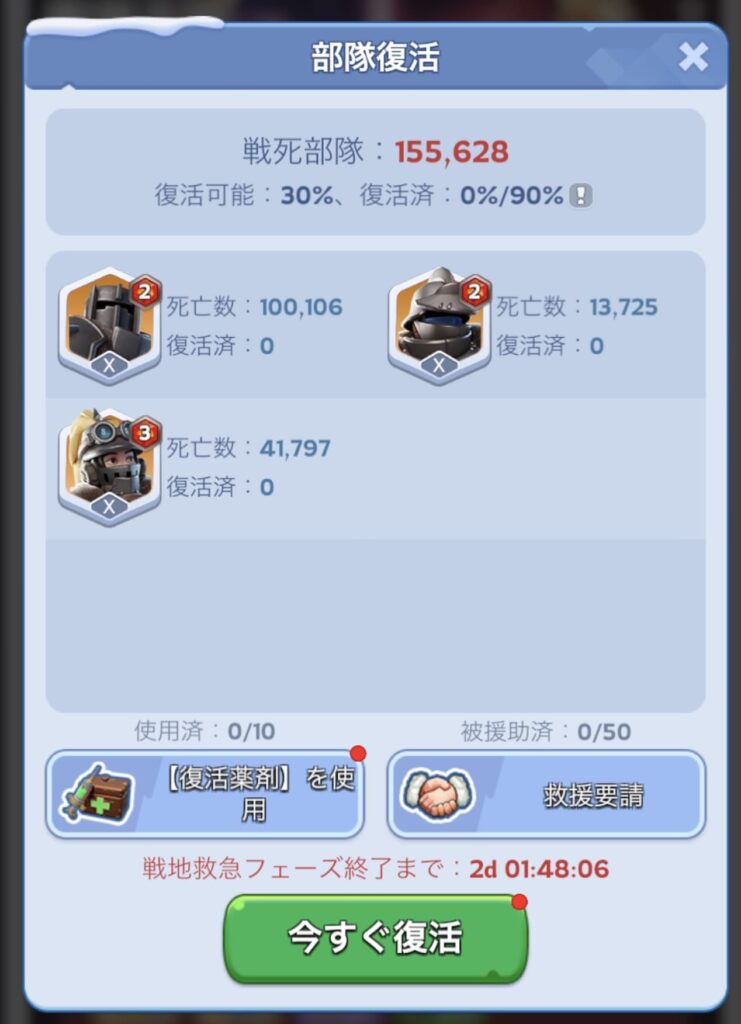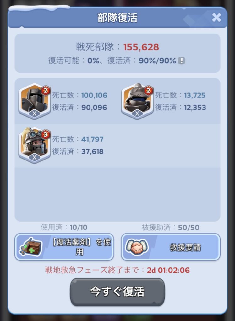 今回はラッキーなことに、みんなからの支援をもらってmaxの9割まで損失兵を復活できた。