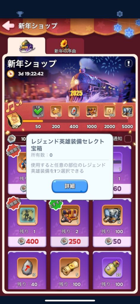 なぜ3つも同時に買ったかというと、このパックに含まれる銀貝を250枚集めると、レジェンド英雄装備セレクト宝箱が1個手に入るからだ。