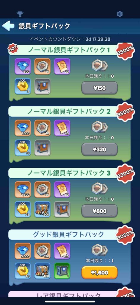 そこから逆算すると、多分イベント終了の3日後までノーマル銀貝ギフトパックを1と2を毎日買い続けなければならない計算になるかな。
