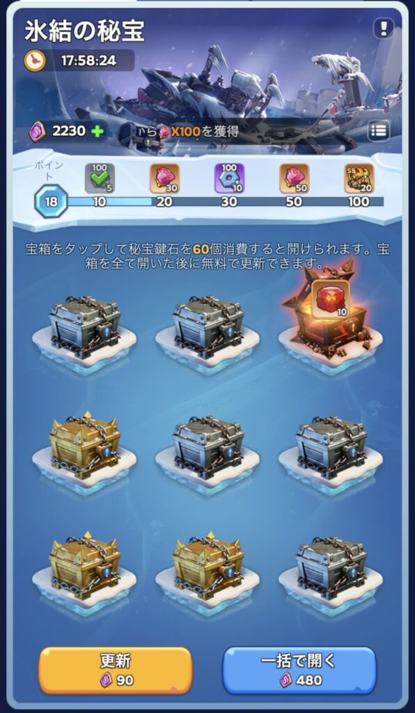 まあ厳密に言えば、無理すればもっと多くのバラを手に入れることはできるんだけど、宝箱をリセットするのに秘宝鍵石を毎回90個も使うのがちょっとバカらしく思えてきたわけ。
