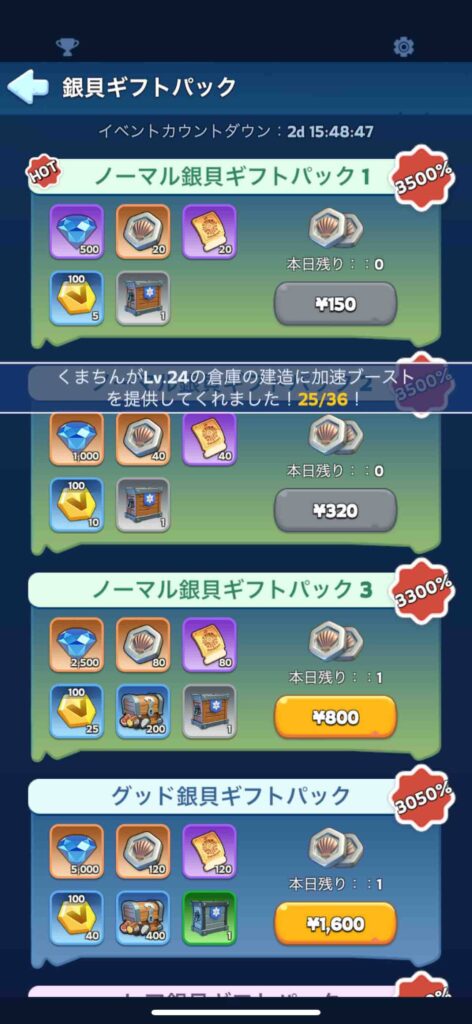 ちなみに今日は、昨日も買ったノーマル銀貝ギフトパックの1と2を追加購入した。