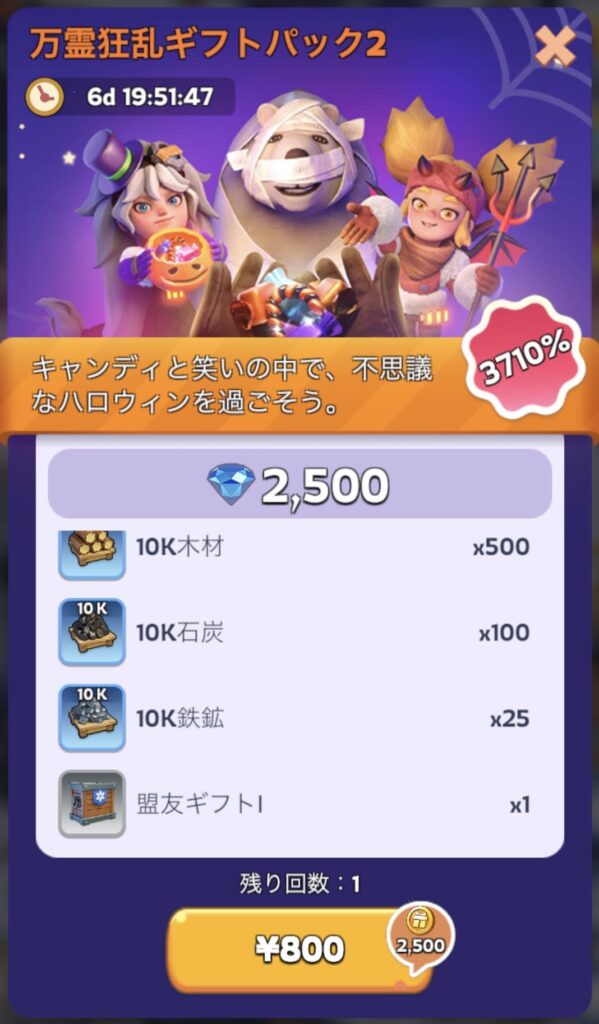 ホワイトアウトサバイバル:ハロウィンイベント中に万霊狂乱ギフトパック2に課金した 課金アイテム X Facebook はてブ LINE Pinterest コピー 2025.10.302025.12.13 今日はホワイトアウトサバイバルで、ハロウィンイベントに関連した万霊狂乱ギフトパック2というのに課金した。課金額は税込800円有効化するだけで部隊能力が上がるアイコンが手に入るから、これは買っとかないと。