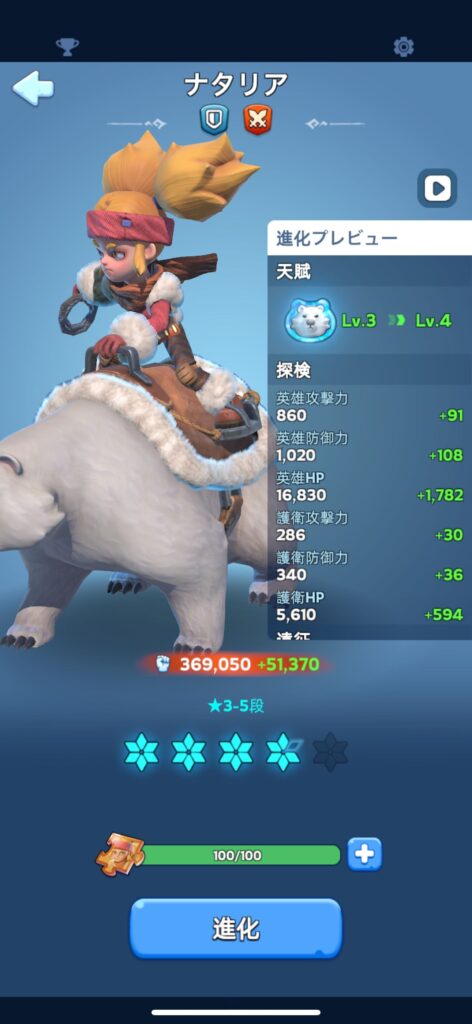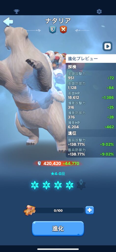 ちょっと出費は大きいけれど、ナタリアのレベルアップは全英雄のレベルアップと同じ効果があるから、バフ効果を上げる意味でもナタリアへの課金は大切と思う。
