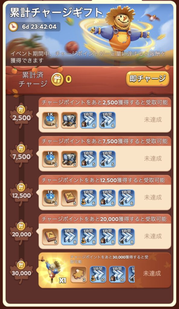 時々開催されるパトリックの料理イベントなんだけど、その中に累計チャージギフトってのがあって、累計チャージが30000ポイントに達すると獣討伐部隊の出征速度が5%早くなるアイコンがゲットできる。