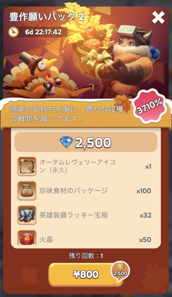 ホワイトアウトサバイバル:豊作願いパック2の課金内容(課金額 税込800円)