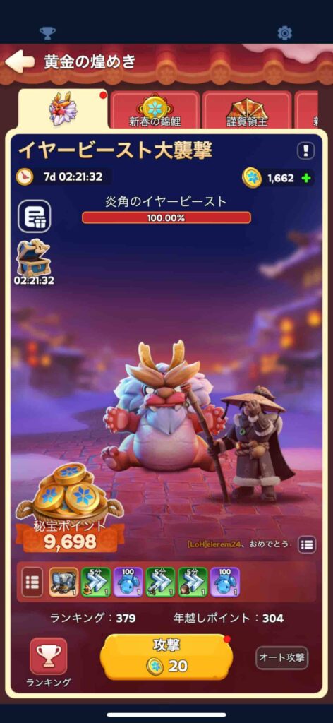 で、このイヤービーストに1回攻撃するために寒玉コインってのが必要なんだけど、これ無課金でも結構簡単に集められるのが嬉しいところ。